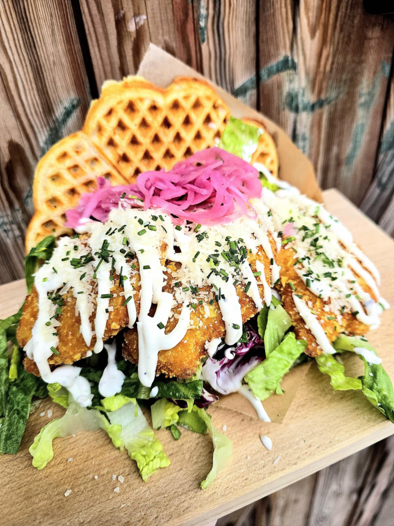 Krispig kyckling, tryffelmayo, parmesan, gräsök & picklad rödlök.